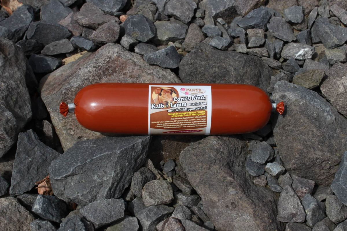 | diese Wurstsorte eignet sich ganz hervorragend für Hunde die Probleme mit Kohlenhydraten haben. Getreidefreie Rezeptur Eine Fleischmahlzeit in High-Premium-Qualität aus Rind, Kalb und Lamm mit 70,0 % Fleischanteil Dieses Gericht mit Leinöl und Grünlippmuschel ist für alle ausgewachsenen Hunde als Alleinnahrung geeignet und wurde in Deutschland nach Lebensmittelstandard hergestellt. Natürlich haben wir auch hier auf zugesetzte künstliche Aroma- und Farbstoffe verzichtet. Auch vielen Welpen schmecken die PANYS Würste, deshalb können Sie Ihrem Welpen im Alter ab 3 Mon. die PANYS Wurst füttern. Hierbei ist zu beachten, dass Welpen während des Wachstums noch einen erhöhten Bedarf an Kohlenhydraten haben. Aus diesem Grund sollten Sie Welpentrockenfutter (ca. 50 %) zufüttern. |