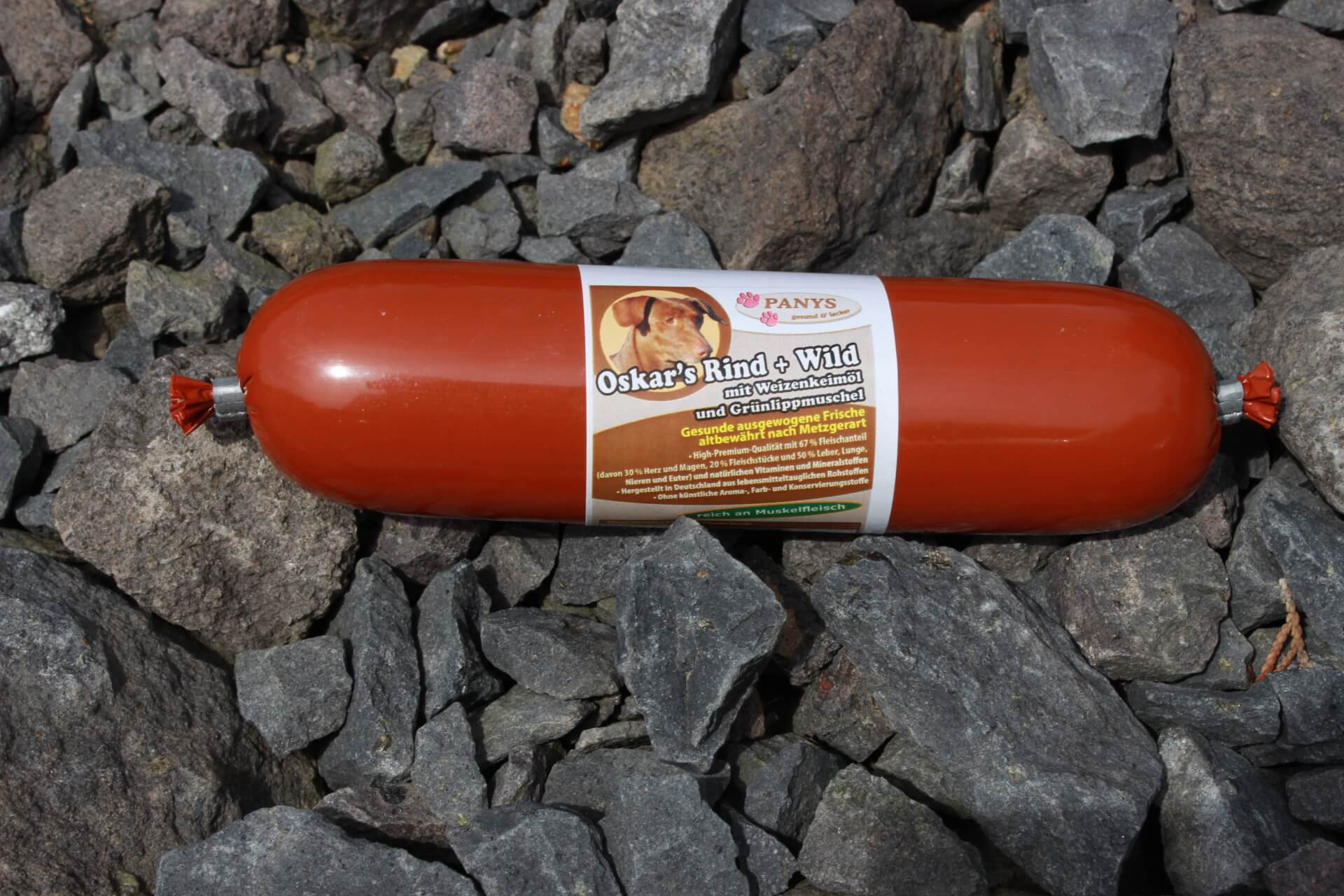 Oskars Jägertopf ist eine Fleischmahlzeit mit 70,0 % Fleischanteil Ideal für alle Hunde, die Geflügelfleischsorten nicht gut vertragen. oder auch für Hunde die Probleme mit Getreide, Reis etc. haben. Hergestellt in Deutschland nach Lebensmittelstandard, natürlich ohne zugesetzte künstliche Aroma- und Farbstoffe. Dieses Gericht ist für alle ausgewachsenen Hunde als Alleinnahrung geeignet und auch Welpen dürfen schon ab einem Alter von 3 Mon. die PANYS Wurst fressen. Da Welpen noch einen hohen Bedarf an Kohlenhydraten haben, bitte auf alle Fälle noch Welpentrockenfutter zufüttern. |